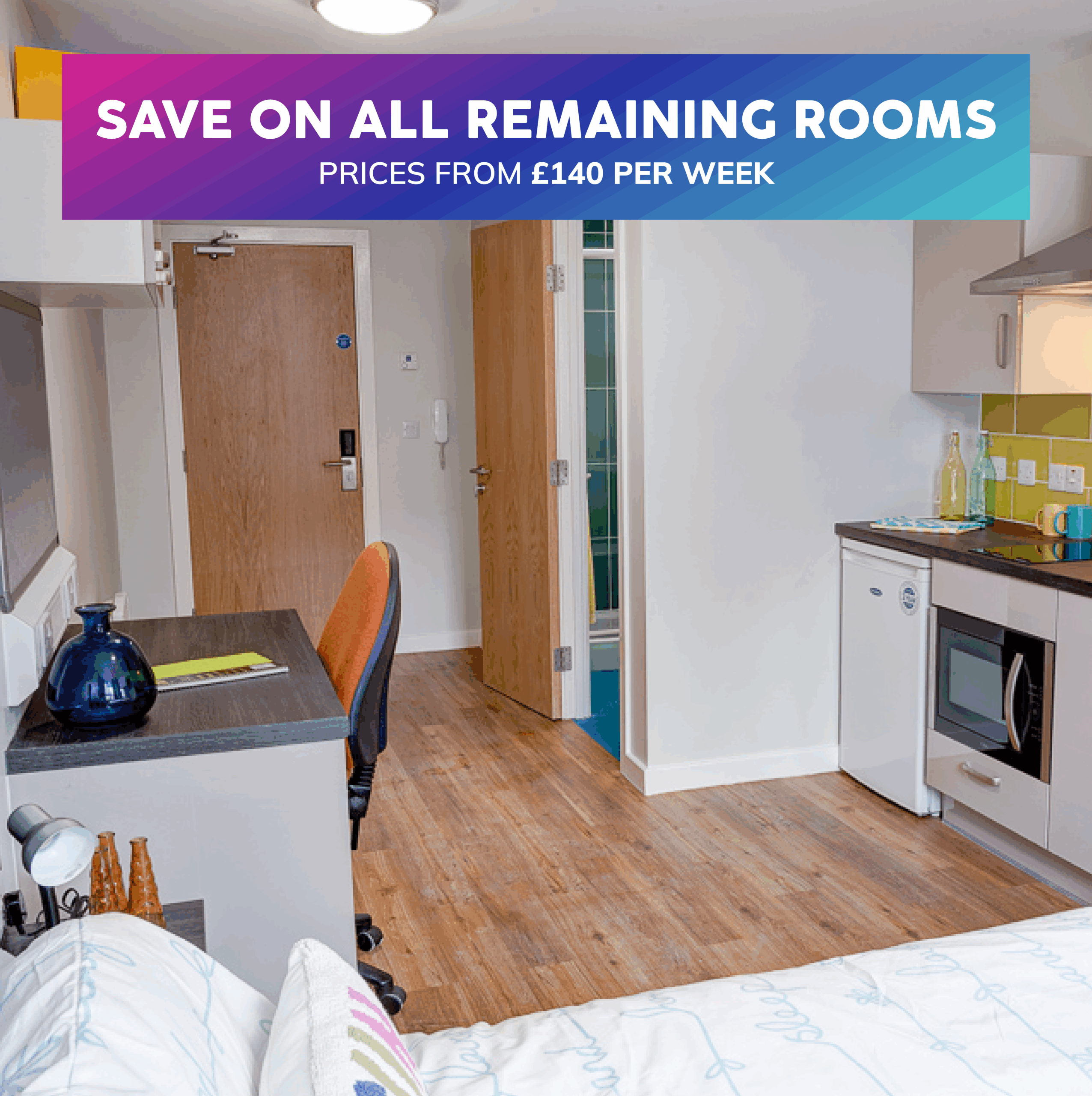 Rooms vary in size and layout, however all include a modern kitchen, en-suite bathroom, study area.