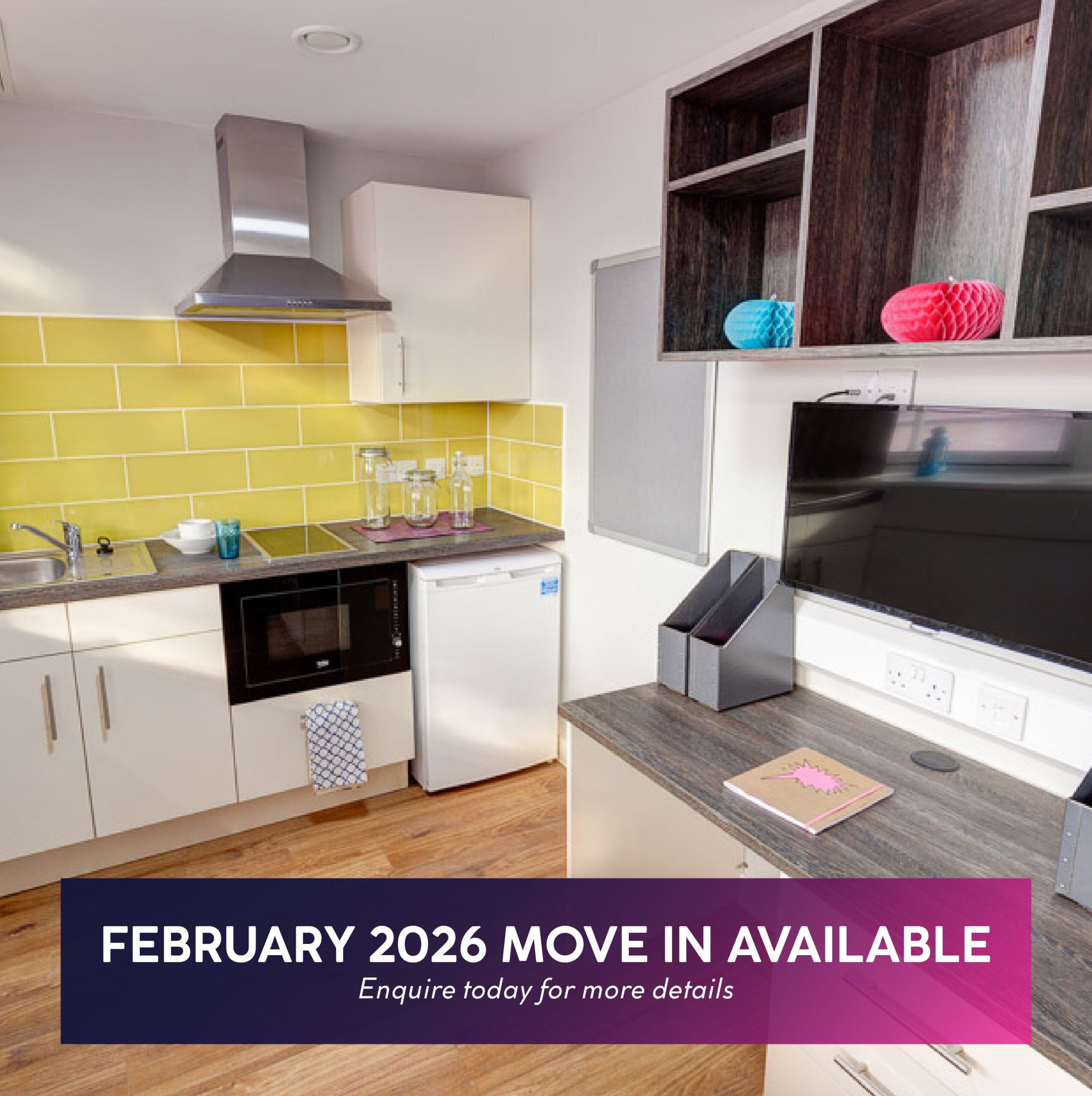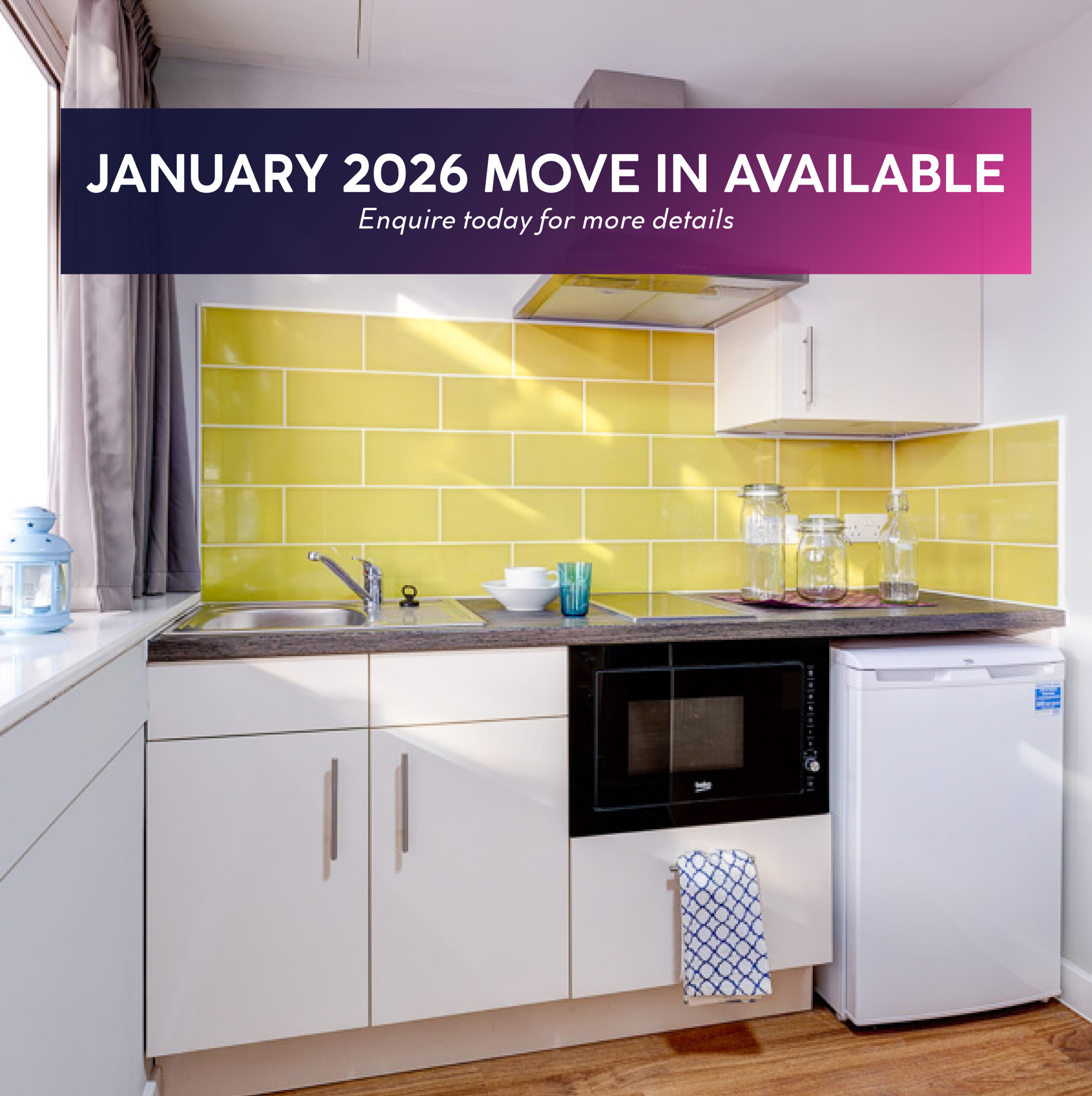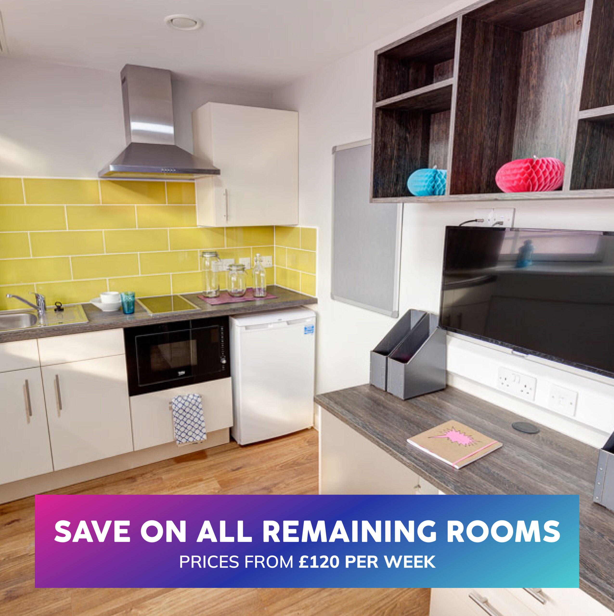 Rooms vary in size and layout, however all include a modern kitchen, en-suite bathroom, study area.