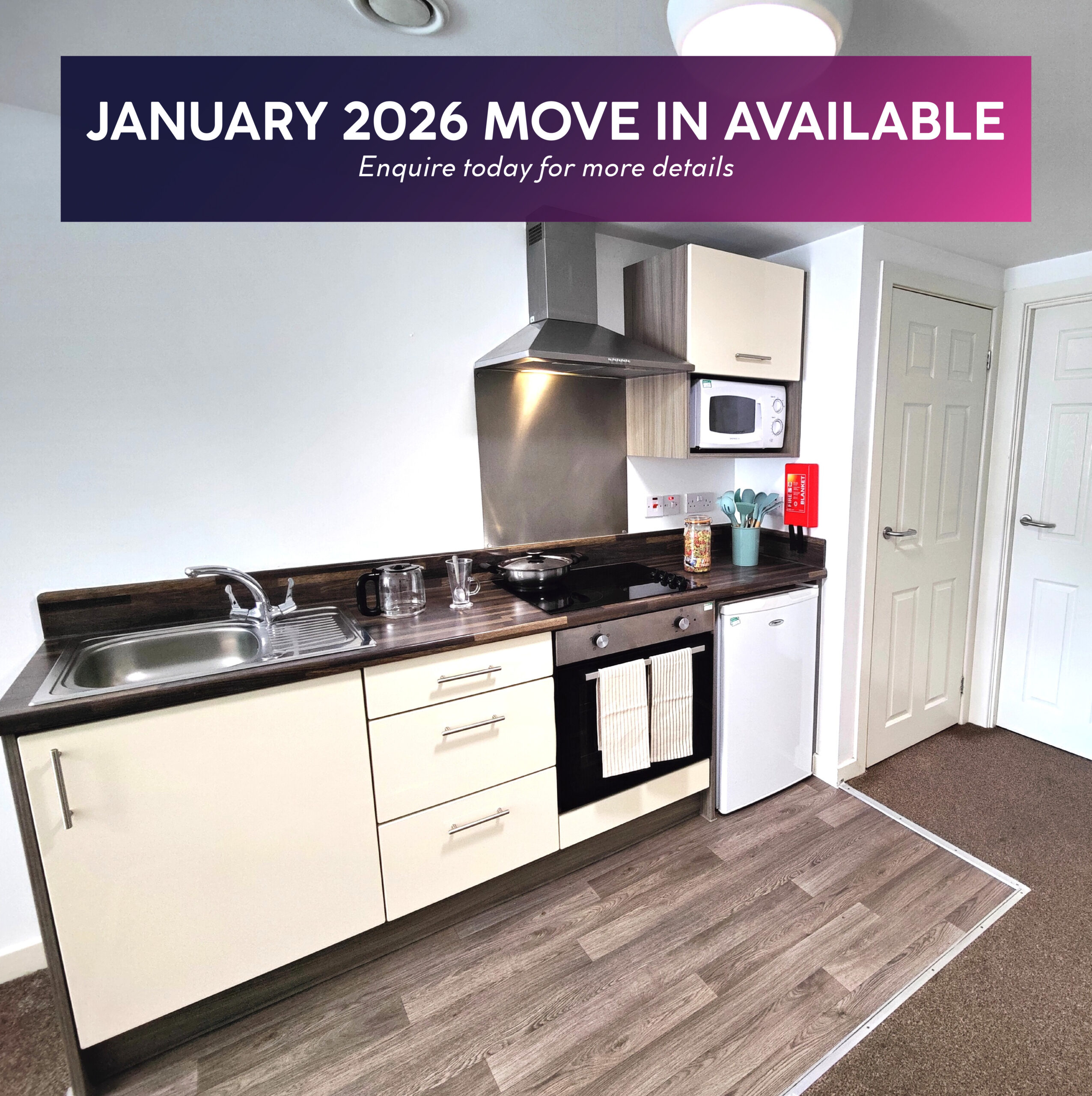 Rooms vary in size and layout, however all include a modern kitchen, en-suite bathroom and study area.